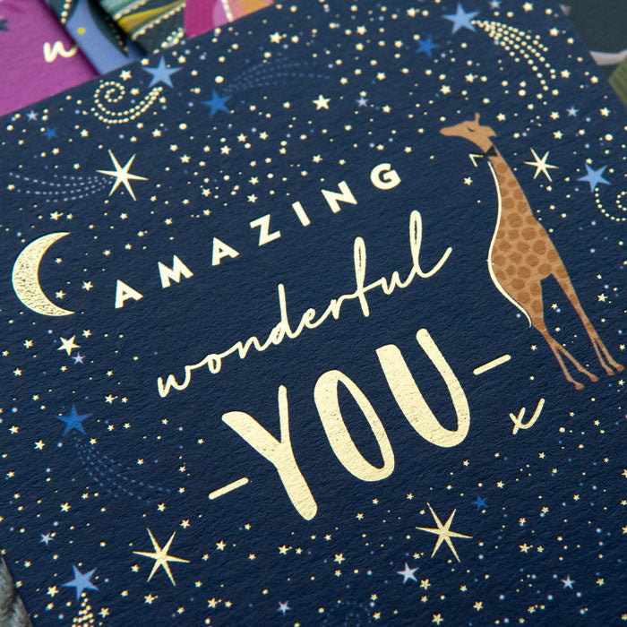 Montrez votre amour et votre reconnaissance avec cette carte « Amazing Wonderful You » de Sara Miller London. Avec une girafe pleine de caractère sur fond étoilé et le message « Amazing, Wonderful You », cette carte aux ornements dorés est le moyen idéal de leur montrer à quel point ils comptent pour vous.