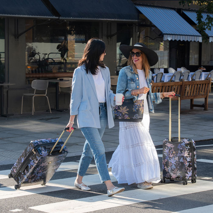 The ultra-lightweight, durable matte shells feature dramatic oversized foliage in muted dusky tones, beautifully embellished with gold accents on a solid black background, and are offset with metallic detailing and branded hardware. Inside, the cases are paired with a subtle lining featuring delicate little leaves complementing the eye-catching, decorative outer design. The on-trend print is both striking and bold with the added luxury of decorative gold details.