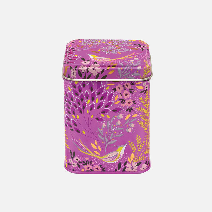 Bring a touch of charm to your home with this Mauve Songbird Mini Rectangular Tin from Sara Miller London's Haveli Garden Collection. Featuring enchanting songbirds settled in an idyllic meadow of exotic tree blossoms set against a rich pink backdrop, this opulent designer tin caddy is guaranteed to add a splash of colour to your everyday - perfect as a gift for a loved one or for keeping your own bits and bobs organised.