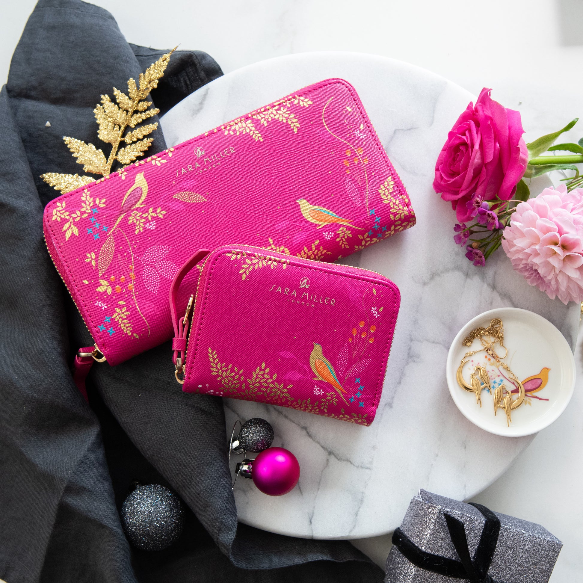Step out in style with this Pink Birds Large Zip Purse from Sara Miller London's Chelsea Collection. Featuring an array of stunning birds in an enchanted garden setting, this ladies designer purse is sure to add a touch of luxury to your everyday. Essential internal compartments will keep your cards, coins and notes all in one secure place. The striking print includes the added opulence of decorative gold foil details, making it perfect for an evening out or for running your everyday errands. The designer zip purse is embellished with a delicate gold logo with etched Sara Miller London zip pulls. The intricate gold detailing is beautifully set against the durable yet luxurious saffiano embossed fabric.